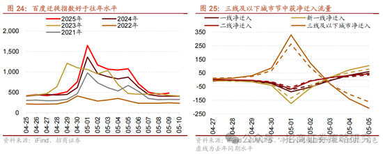 百度迁徙指数好于往年水平,仅三线及以下城市节中获净迁入流量,县域逆袭特征明显。五一假期期间(5/1-5/5),百度迁徙指数均值录得1200.25,较2024年同期增长22.4%,其中4个一线、15个新一线、30个二线、三线及以下城市日均迁入规模指数同比分别增长23.7%、20.3%、23.8%和22.3%。居民跨市出行偏好视角,本次假期仅三线及以下城市节中获净迁入流量,县域逆袭特征明显。