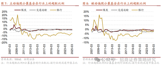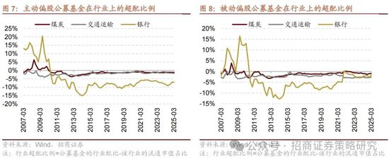 公募基金对高分红行业尤其银行长期处于低配状态,不过被动基金正在缩小这一差距,未来随着公募基金更加重视收益稳定性,对银行的低配比例可能进一步收窄。2010年以来,主动偏股公募基金对银行、煤炭、交运等高分红行业基本处于低配状态,尤其银行低配比例长期超过5%,到2025年一季度低配7.1%。相比之下,被动偏股公募基金在这些行业也相对低配,不过低配幅度比主动偏股公募基金相对小一些,2025Q1被动偏股公募基金在银行的低配比例为1.7%。