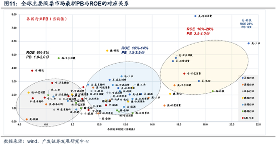 最后,ROE位于6%-8%,对应PB在1.0倍-2.0倍。这一圈层主要是东亚的各类行业,内卷、制造业是这一区域的主要标签。