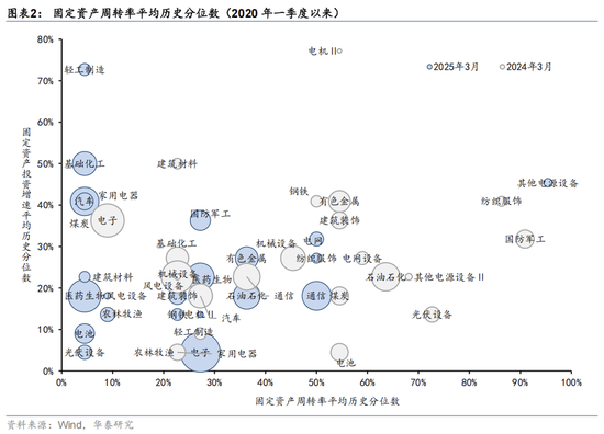 从产能利用率的分布上看,上一轮更多集中在钢铁、水泥、煤炭等上游行业,而这一轮更具广谱性。我们以固定资产周转率衡量制造业行业的产能利用水平,2025年一季度,多数制造业行业固定资产周转率(TTM)位于50%分位数以下,而有过半数行业在30%分位数以下,不仅仅是钢铁、化工与煤炭等传统行业,汽车、机械、军工等优势行业,光伏、风电与电池等新兴行业均存在不平衡的问题,也是本轮“反内卷”的重点行业。