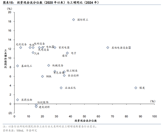 (5)需求前景,需求端在生产端形成映射,为了剔除价格影响,我们选取工增表征行业当前的需求现状。截至2024年,多数行业投资开始呈现收敛态势,但需求端分化较为明显,光伏、电池、电网等行业需求尚有支撑,而建材、纺织、钢铁等行业需求相对偏弱,对应新旧动能切换阶段的经济结构差异。