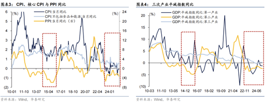 表现在价格上,2014-2015年期间PPI下滑、但CPI基本稳定。而本次是CPI与PPI双低,从上游到下游、从二产到三产、从商品到服务均有一定传导,经济量价背离的时间相对更长。