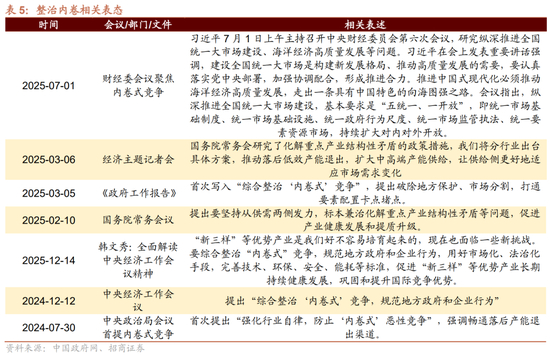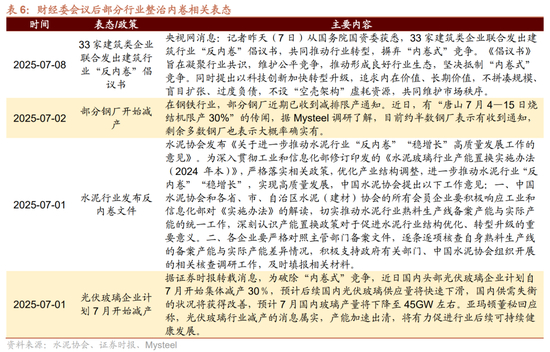 关于反内卷,后续需要关注分行业化解产业结构性矛盾的政策出台。从近期行业的表态来看,建筑、钢铁、水泥、光伏玻璃等行业对整治内卷有一定的表态。从后续关注点来看,政策预期上分行业化解产业结构性矛盾的政策尚未出台,有望尽快落地。从发改委表态来看,不同行业的整治手段或不尽相同:炼油、钢铁等行业或主要通过化解存量过剩产能的手段进行优化;煤化工、氧化铝等行业或通过遏制产能盲目扩张的手段进行控制;新能源汽车、光伏等“新三样”行业或通过行业自律—即加强企业行为约束的方式来进行监督。