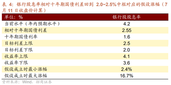 因此,目前来看,股息率下行带来的银行股估值重估仍然存在一定涨幅空间。如果银行股息率相对十年期国债利率利差从当前位置继续收敛至2~2.5%,对应的股息率为3.6~4.1%,在这种假设之下,理论涨幅大概是2~17%之间。