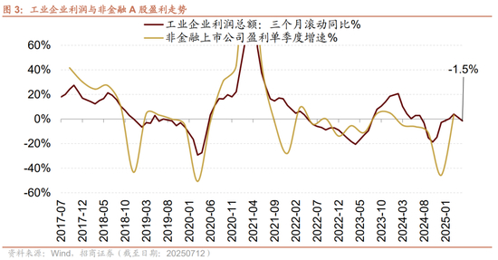 预计A股2025年中报盈利改善幅度有限或仍将有压力。参考工业企业盈利指标,规模以上工业企业2025年前四个月持续改善,但五六月份,随着关税的扰动、生产和投资端增速的放缓,工业企业盈利增速转负,单5月增幅转负至-9.1%,同时6月份PPI降幅继续扩大,将进一步掣肘企业利润率的修复。由于工业企业和非金融类上市公司的成分股具备有一定的重合度,且二者利润增速历史值几乎保持相似的变动趋势,预计整体A股盈利二季度改善幅度有限或仍将有压力。