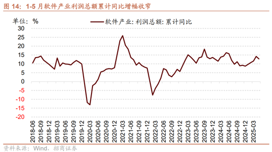 1-5月软件产业利润总额累计同比增幅收窄。1-5月软件产业利润总额累计同比上行12.80%,较2025年1-4月累计同比增幅收窄1.40个百分点。