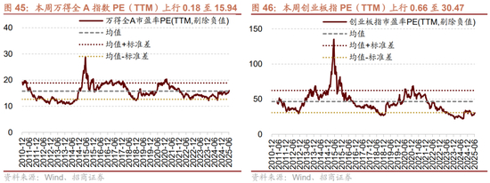 本周整体A股估值水平上行。截至7月11日收盘,万得全A指数PE(TTM)为15.94,处于历史估值水平(10年以来)的57.1%分位数。创业板指PE(TTM)上行0.66至30.47,处于历史估值水平的13.0%分位数。代表大盘股的沪深300指数PE(TTM)上行0.07至12.62,处于历史估值水平的66.7%分位数。代表中小盘股的中证500指数PE(TTM)上行0.48为22.88,处于历史估值水平的40.1%分位数。