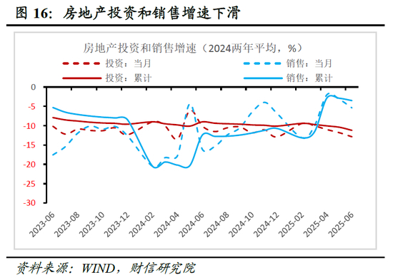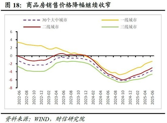 领先指标预示投资增速处于筑底阶段。一是房企融资压力有所加大,如2025年6月房地产资金来源累计同比下降6.2%,降幅较5月份扩大0.9个百分点,在低基数基础上,降幅进一步扩大,表明房企融资压力加大。其中,细项中国内贷款增速有所上升,显示出“白名单”等政策对房企的支持较为有力;但居民购房速度放缓,定金及预收款和个人按揭贷款增速均下降较多,拖累房企融资。二是土地市场有所恢复,但房企拿地意愿偏低。如1-6月100个大中城市、一线、二线、三线城市成交土地面积增速分别为-7.7%、-4.3%、0.5%、-11.7%,较5月分别提高2.0、1.5、0.5、2.5个百分点,但除二线城市外仍为负增长,显示出房企拿地意愿偏弱。三是作为房地产投资领先指标的房地产销售面积降幅小幅扩大,预示未来房地产投资增速继续筑底的可能性较大,企稳需政策力度进一步加大。