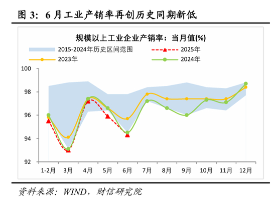 往后看,各类存量增量政策进一步发力显效和新质生产力蓬勃发展,有望继续对工业生产形成一定支撑;但下半年内外需放缓压力均加大,经济“供强需弱”矛盾依旧突出(6月规上工业企业产销率刷新历史同期新低(见图3)),加上中央加强综合整治“内卷式”竞争,工业生产增速大概率趋于放缓。