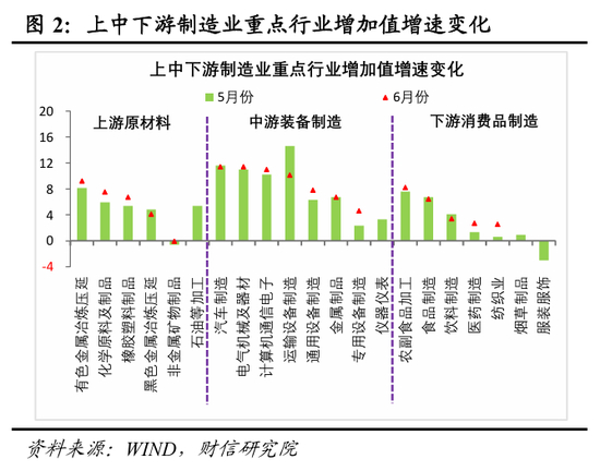 上半年全国规模以上工业增加值同比增长6.4%,高于去年全年0.6个百分点,处于偏高水平;6月当月同比增长6.8%,较上月提高1.0个百分点(见图1),大幅好于市场预期。工业生产维持强劲增长势头,背后的驱动力量主要有三:一是中美关税暂缓推动出口需求回暖,带动相关生产活动回升较多,如外商及港澳台投资企业增加值增速较上月提高1.6个百分点。二是新动能的支撑作用进一步增强,6月份高技术制造业增加值增长9.7%,高于全部规上工业2.9个百分点,较上月提高1.1个百分点。三是受益于原油、有色金属等价格的回升,上游原材料行业生产活动改善较多(见图2)。