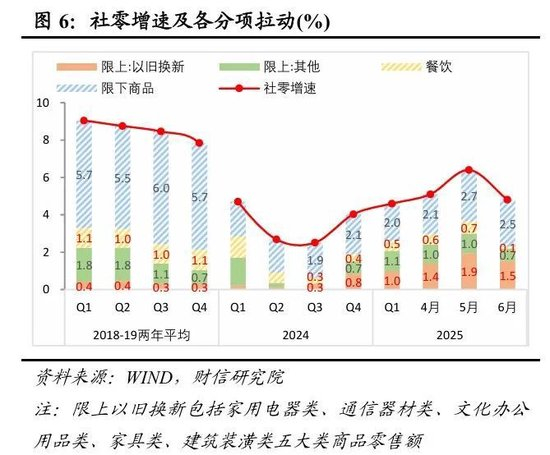 一是餐饮收入拖累显著。受京东、美团等外卖平台开启低价补贴大战、集中整治违规吃喝等因素影响,6月份餐饮收入增速较上月大幅回落5个百分点至0.9%,对社零的拉动较上月降低0.6个百分点(见图5-6),为最主要拖累因素。二是以旧换新政策带动作用有所放缓。6月份限额以上单位家用电器类、家具类、文化办公用品类、通信器材类、建筑装潢类商品零售额分别增长32.4%、28.7%、24.4%、13.8%、1.0%,除建筑装潢外仍保持较高增速,但普遍较上月有所放缓,五者合计拉动社零增长1.5个百分点,比上月回落0.4个百分点(见图6-7)。三是“6.18”促销前置透支部分需求,拖累升级类商品增速回落较多。如限额以上体育娱乐用品类、金银珠宝类、烟酒类商品零售额增速均较上月回落10个百分点以上(见图7)。四是中低收入群体消费小幅回落。6月份代表中低收入群体消费的限额以下商品零售增速,较上月小幅回落,对社零的拉动较上月降低0.2个百分点(见图6)。但值得欣喜的是,受益于汽车行业反内卷取得一定积极成效、政策刺激力度较大和低基数效应,6月汽车类商品零售额同比增长4.6%,较上月提高3.5个百分点。