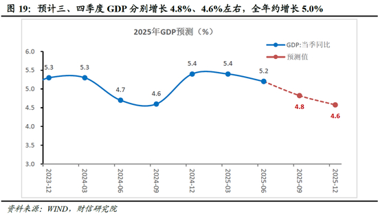综合上述因素,预计三、四季度GDP分别增长4.8%、4.6%,全年增长5.0%左右(见图19)。上行风险是关税谈判结果大幅好于预期,下行风险是谈判结果大幅低于预期、地缘政治风险快速加剧、国内增量政策力度不及预期或出台偏慢。