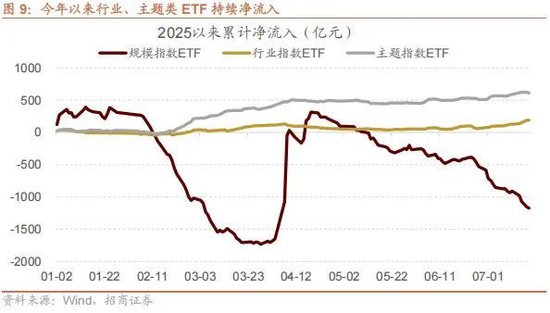 行业与主题类ETF不断流入,是今年市场的重要特征。过去两年,ETF的规模快速成长主要集中在以沪深300为代表的宽基指数,一方面是因为汇金等机构投资者借道入市,另一方面则是在市场震荡偏弱的环境下,部分投资者选择与大资金站在一起,通过“跟庄”的方式进行防御。而今年2月份以来,随着市场持续震荡上行、赚钱效应逐步显现,指数搭台、题材唱戏的行情使得行业与主题类的ETF更加受到投资者的欢迎,在数据上体现为行业ETF持续的净流入,而政策属性相对更强的宽基类ETF,除了4月初因为维护市场快速增长外,规模逐渐下滑。