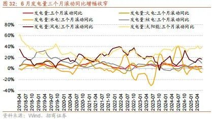 6月全国发电量三个月滚动同比增幅收窄。1-6月份,我国累计发电量45371.00亿千瓦时,同比增幅扩大0.5个百分点至0.80%,三个月滚动同比增幅收窄0.1个百分点至3.2%。其中火电三个月滚动同比转正,水电三个月滚动同比降幅扩大,风电、核电三个月滚动同比增幅收窄,太阳能三个月滚动同比增幅扩大。