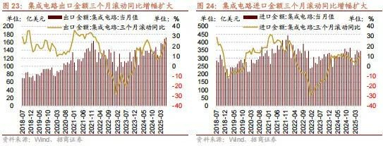 6月集成电路出口金额同比增幅收窄,进口金额同比增幅扩大,当月贸易逆差扩大。6月集成电路出口金额为172.19亿美元,当月同比增幅收窄9.22个百分点至24.22%,三个月滚动同比增幅扩大5.44个百分点至25.76%;6月集成电路进口金额为345.84亿美元,当月同比增幅扩大2.59个百分点至11.46%,三个月滚动同比增幅扩大2.64个百分点至10.48%。当月贸易逆差环比增加3.29%至173.66亿美元。
