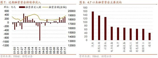 融资资金持续净流入,偏好科技成长方向。融资资金有明显的“浮盈加仓”特点,在牛市中较容易成为增量资金,今年 4 月以来,伴随着指数的不断突破,融资资金呈现温和净流入态势,目前融资余额已达 1.89 万亿,逼近前高。从行业流向来看,汽车、医药生物、计算机等科技成长方向 4 月以来融资流入较多,而驱动指数上涨的银行、非银板块并未有较多融资资金的流入。