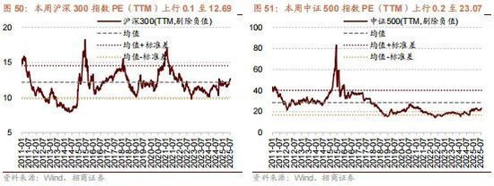 本周整体A股估值水平上行。截至7月18日收盘,万得全A指数PE(TTM)为16.08,处于历史估值水平(10年以来)的57.5%分位数。创业板指PE(TTM)上行0.74至31.22,处于历史估值水平的14.5%分位数。代表大盘股的沪深300指数PE(TTM)上行0.07至12.69,处于历史估值水平的67.0%分位数。代表中小盘股的中证500指数PE(TTM)上行0.22为23.07,处于历史估值水平的41.1%分位数。