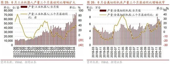6月工业机器人产量同比增幅扩大,三个月滚动同比增幅扩大。6月工业机器人产量7.48万台/套,当月同比增幅扩大2.40个百分点至37.90%,三个月滚动同比增幅扩大7.07个百分点至41.63%;1-6月累计产量36.93万台/套,累计同比增幅扩大3.60个百分点至35.60%。