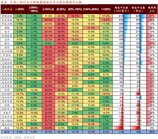 截至8月22日,共有2503家上市公司披露了2025年中报业绩预告/快报/报告,约占全部A股的46%。从目前披露样本增速中位数来看,非银、农林牧渔、有色、钢铁、电子、机械等行业上半年累计增速中位数相对较高;此外汽车、银行、通信、电力设备、计算机和基础化工行业目前披露个股中报累计增速中位数在10%以上。煤炭、建材、轻工、石油石化、房地产等行业目前披露个股的中位数增速相对较低,预计对整体A股盈利仍有拖累。