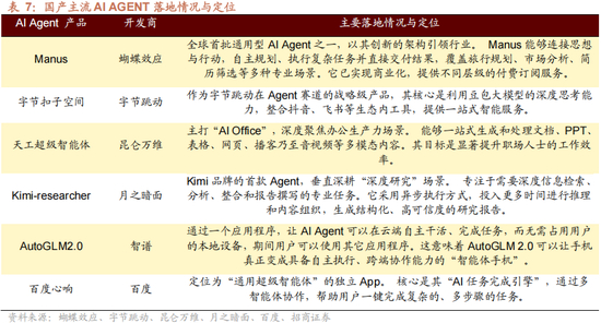 中国AI Agent市场正迎来爆发期。插入数据。国内的科技巨头如百度、华为,以及领先的AI创业公司如蝴蝶效应,都在积极研发和部署各自的Agent产品 。今年以来,国产AI Agent领域涌现出众多突破性产品,均致力于实现更高阶的自主任务执行能力。年初,蝴蝶效应宣布自己发布的Manus Agent为“全球首款通用AI Agent”,其核心亮点在于能模拟人类工作流,直接操作电脑交付完整成果而非仅提供文本回复。除了Manus外,月之暗面推出Kimi-Researcher也值得注意,通过端到端强化学习训练,专注于深度研究与信息整合,能在包含数百步的复杂查询中自主探索与纠错,刷新了相关技术基准的世界纪录。8月,北京智谱华章科技有限公司发布了全球首个手机Agent产品 AutoGLM 2.0,进一步升级其在手机端的智能助理能力,这款产品在去年推出的 AutoGLM 基础上迈出实质性应用落地的一步。这些全新的AI Agent标志着国产AI正从内容生成向自主完成复杂任务的更高维度进化。