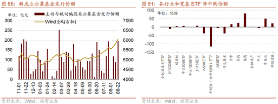 从ETF净申购来看,ETF净申购,宽指ETF以净赎回为主,其中科创50ETF赎回最多;行业ETF以净申购为主,其中券商ETF申购较多,信息技术ETF赎回较多。具体来看,股票型ETF总体净申购1.9亿份。其中,沪深300、创业板ETF、中证500ETF、上证50ETF、双创50ETF和科创50ETF分别净赎回11.5亿份、净申购4.9亿份、净申购7.3亿份、净申购8.3亿份、净赎回37.6亿份、净赎回115.7亿份。行业方面,信息技术ETF净赎回38.1亿份;消费ETF净申购16.8亿份;医药ETF净申购23.6亿份;券商ETF净申购81.1亿份;金融地产ETF净申购1.9亿份;军工ETF净赎回6.3亿份;原材料ETF净申购50.3亿份;新能源&智能汽车ETF净申购22.3亿份。