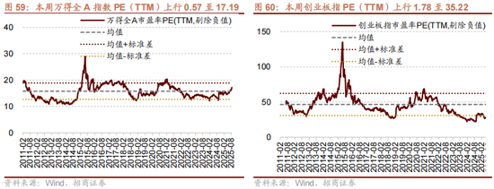 本周整体A股估值水平上行。截至8月22日收盘,万得全A指数PE(TTM)为17.19,处于历史估值水平(10年以来)的67.4%分位数。创业板指PE(TTM)上行1.78至35.22,处于历史估值水平的24.1%分位数。代表大盘股的沪深300指数PE(TTM)上行0.46至13.22,处于历史估值水平的74.5%分位数。代表中小盘股的中证500指数PE(TTM)上行0.74为25.23,处于历史估值水平的47.1%分位数。