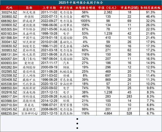 下表为根据2025年中报筛选同时满足“标题超预期≥1家”和“盈利预测上调≥2家”的个股,共47只。组合内龙头公司表现依然出色,如阳光电源(+91.3%),新强联(+46.4%)、建投能源(+26.0%)、生益科技(+21.6%)。