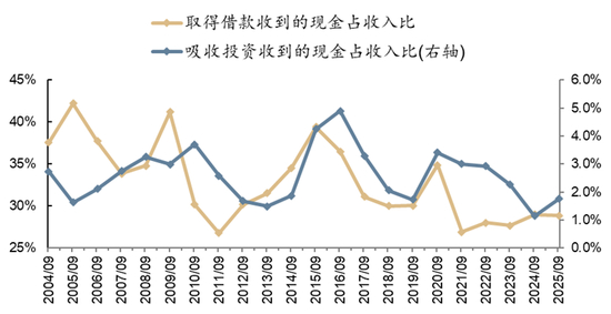 但历年来看目前筹资现金流占收入比仍处历史低位,主要是吸收投资收到的现金及取得借款收到的现金占比较低拖累。