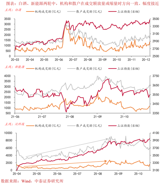 为了探明本轮行情中机构与散户资金的表现特征,以2020 年以来的20 年白酒消费、21 年新能源、25 年科技这三轮主线行情做对比分析。可以发现:白酒、新能源两轮中,机构和散户在成交额放量或缩量时方向一致、幅度接近,基本是“机构先行、散户追随”,随后一起加速、一起退潮,成交额波动大、节奏演绎比较快。
