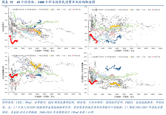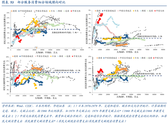 11、消费:如何提升消费率?首先,将居民消费率拆分为消费倾向、初次分配、二次分配三要素后,与海外同等发展阶段的经济体相比,中国主要是消费倾向偏低,二次分配力度不足,政策重心或需持续聚焦优化收入分配以及提振居民意愿。其次,从消费结构来看,服务消费占比偏低。在人均GDP相似阶段,我国居民服务消费占比略低于平均水平。若进一步观察2024年的最新截面数据,有最近数据的29个经济体均值为56%,高出我国约20个百分点;美德日韩高出我国10-15个百分点。服务消费的结构来看,教育、居住为代表的民生类支出偏高,文娱、出行为代表的升级型消费明显偏低。