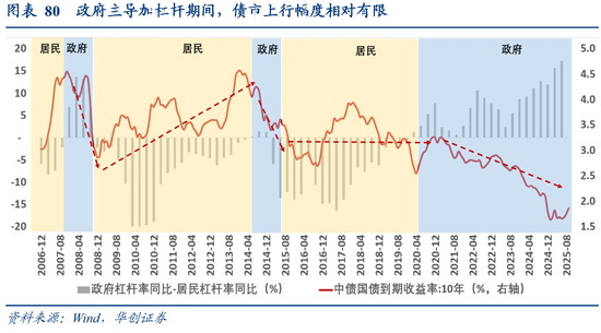 从幅度来看,即便利率抬升,我们也认为利率大幅抬升的概率不高,利率客观存在安全边际。历史经验下,政府主导加杠杆(政府杠杆率增速高于居民杠杆率增速)期间,十年期国债的上行空间相对有限。其背后逻辑在于,私人部门的投资追求“利润最大化”,而政府投资以公共项目为主,而公共项目本身少有“自负盈亏”的,其意义在于外部性的社会收益。因此政府主导的加杠杆期间,短期资本回报率抬升空间有限,利率上行幅度也自然有限(当前货币政策和财政政策强调保持协同,这一逻辑或会有所强化)。