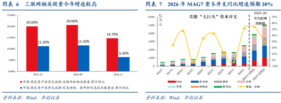 4、科技侧:新一轮AI革命浪潮下,中游或已受益,体现在:1)美股“七姐妹”(MAG7)资本开支或保持偏强。根据彭博预期,MAG7合计资本开支2025年或达3889亿美元,增速53.8%,高于2024年增速51.5%,2026年资本开支或进一步升至5050亿美元,规模达到美国2024年度GDP(29.3万亿美元)的1.7%。2)美国科技企业的高额资本开支或拉动科技进口需求。我们将计算机投资、电力与通讯投资、软件投资合并称为“AI相关投资”,将资本品中的计算机及相关设备进口视为对应的“AI相关进口”。2025年上半年,美国AI相关投资(剔除价格因素)达2.4万亿美元,其中AI相关进口达5150亿美元,占比约为21.3%;上半年AI相关投资实际同比增速高达13.1%(2024年为8.2%),AI科技资本品进口量同比59.5%(2024年为41.8%)。3)中国互联网和相关服务业的投资增速快速上行,1-10月,增速为20%,去年为14.7%。