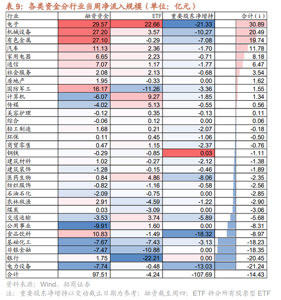 两融方面,融资资金前四个交易日净流入100.1亿元。从行业偏好来看,本周融资资金集中买入电子,净买入额达29.6亿元,其他净买入规模最高的行业主要包括机械设备、有色金属、国防军工等;净卖出的主要是公用事业、电力设备、基础化工等。