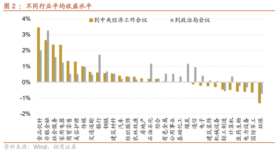 从平均收益水平来看,到政治局会议期间,非银、食品饮料、银行等行业平均收益水平相对较高;到中央经济工作会议期间,食品饮料、非银、社服等行业平均收益水平相对较高。