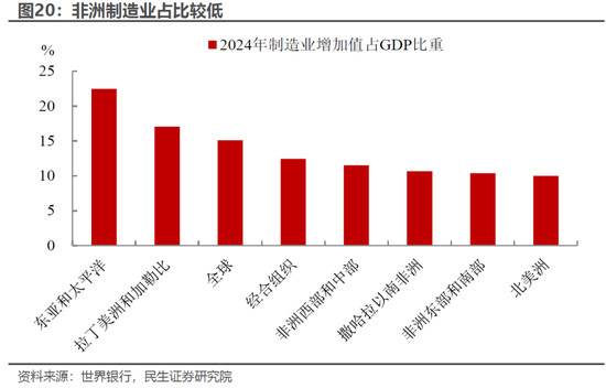 非洲制造业占比低,工业化转型空间较大,但离不开中国持续的投资支持。非洲工业化进程起步晚、底子薄,2024年制造业增加值占GDP比重约10%-11%,远低于东亚等部分发展中国家20%的平均水平。但凭借自然优势和人力成本,增长空间较大,在国内政策推动与外部合作(中国持续加大投资)下,正加速其从“初级产品输出”向“制造业升级”转型,这为中非贸易提供了广阔的产业升级需求。