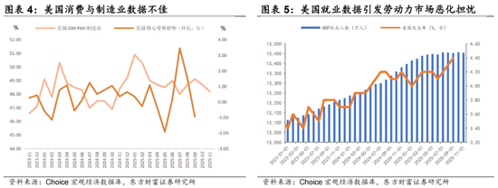 美国多项疲弱数据强化了市场对于12月会议降息的预期。9月失业率跳升至4.4%,11月ADP私营部门就业人数环比减少3.1万人;9月核心零售销售环比下降,ISM制造业指数录得48.2,持续位于荣枯线下方,进一步强化了市场对美联储降息的预期。