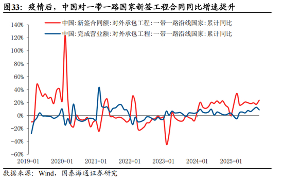 安全与转型压力推动资源国基建突围。全球关税冲突频发,资源品“武器化”特征愈发明显,全球视角下资源国家正在积极加强基建以加强对资源的掌控力,并希望通过多元化转型将更多高附加值资源品深加工环节留在国内,推动国内工业化发展,如巴西、印尼等国,而中东等地也在“后石油时代”的危机感驱动下积极推动服务业、新能源与数字化转型。秘鲁钱凯港、中吉乌铁路等战略通道项目的加速推进正是中国基建出海的重要见证。疫情后,中国对一带一路国家的新签工程合同额同比增速迅速提升。我们认为,资源国正通过基建战略维护资源安全与推动经济转型,为中国轨交设备、电网、工程机械等提供了广阔的市场空间。