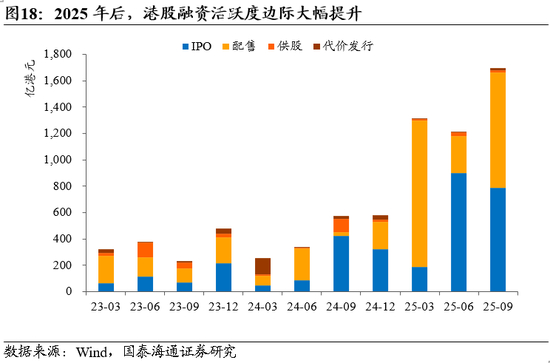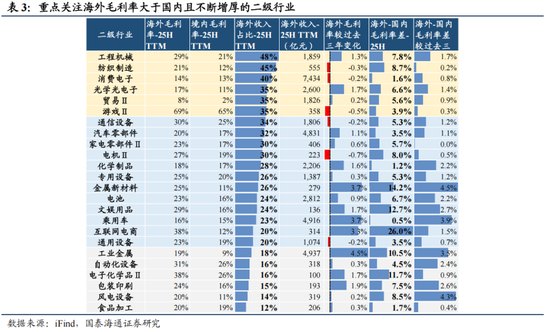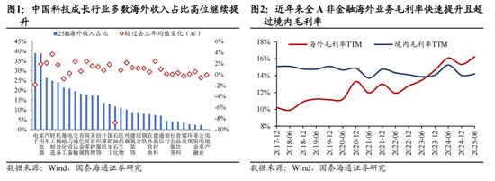 ▶全球产业竞争优势快速提升,中企走向2.0时代体系化出海。中国近年来贸易竞争力快速提升,在电力设备/工程机械/两轮车等资本与技术密集型的行业具备显著优势,同时大幅提升了在乘用车与零部件/机床/新材料/光通信/医疗设备等领域的竞争力。2025年以来中国出口出海屡超预期。关税压力测试之下,出口通过区域多元化与高端化展现出了极强的增长韧性,同时,企业出海明显加速,港股IPO边际活跃,中企正从产品出口走向“产能+品牌+渠道”的体系化出海,实现向“微笑曲线”两端高附加值环节的跃升。我们发现,中国非金融上市公司海外毛利率在2023H1后超过国内毛利率并持续拉开差距。其中海外收入占比提升且海外毛利率优势拉大的行业包括:工程机械/电力设备/汽车与零部件/通信设备/新材料/游戏等。