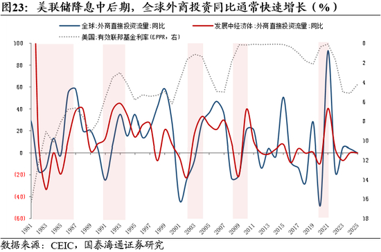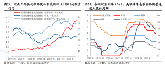 全球进入宽松周期后半程,非AI部门与新兴市场资本开支进入上行周期。随着以美联储为代表的全球主要央行货币政策进入宽松的后半程,叠加地缘政治驱动的供应链重构和新兴市场的工业化浪潮,全球非AI部门的资本开支(Capex)有望迎来一轮显著的上行周期。历史经验来看,美联储降息周期中后期全球外商投资同比增速往往有比较明显的高增长脉冲,而缺乏原始资本的新兴市场往往受益。在联储降息之下,新兴市场央行也同步进入降息周期,国内受抑制的信贷增长有望恢复,尤其是长周期、高杠杆的基建项目。另一方面来说,过去两三年的高利率环境下,发达经济体内部资本开支主要依赖AI领域的资本开支。以美国为例,近年来利率敏感的住宅开发和制造业厂房建设相对停滞,利率的进一步下降的背景下,非AI部门的资本开支也将受益于更宽松的金融环境