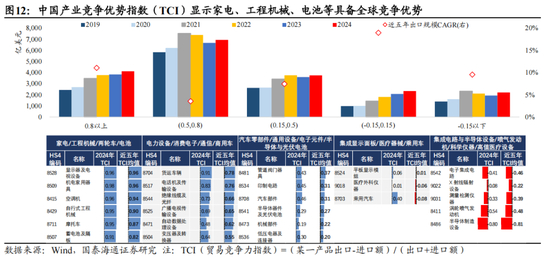 中国产业全球竞争力持续攀升,带动出口高速增长。哈佛大学增长实验室发布数据显示,2023年中国在经济复杂度指数排名中持续攀升,目前已位列全球第16位,较十年前提升了8位 。中国制造业正从“世界工厂”向“全球智造中心”飞跃。与早期的加工贸易不同,当前中国在光伏、锂电池、新能源汽车等“新三样”领域不仅掌握了终端制造能力,更在核心零部件、专用设备和原材料环节实现了高度自主可控与技术领先优势。贸易竞争力指数(TCI)显示,中国在资本与技术密集型产业具备显著的全球竞争优势,如工程机械/家电/两轮车/电池,上述行业近五年出口复合增速高达11%。另一方面,尽管中国在集成电路/喷气发动机/科学仪器/高端医疗设备等领域全球竞争优势较弱,但近年来也在持续加大产业链“补短板”。如果从TCI指数的变化情况看,中国制造业正在乘用车/机床/高端合成树脂/医疗设备/光通信/低压电器等领域迅速崛起,TCI指数的变化与近年出口复合增速呈现出高度正相关,证明产业竞争优势的提升一定会带动出口出海的加速。