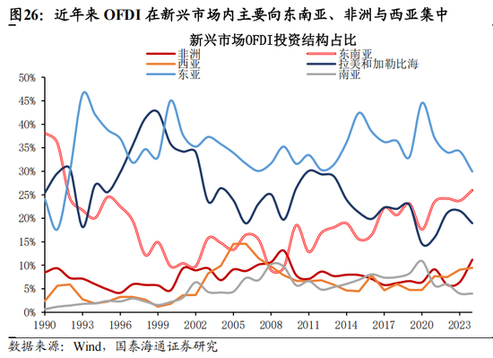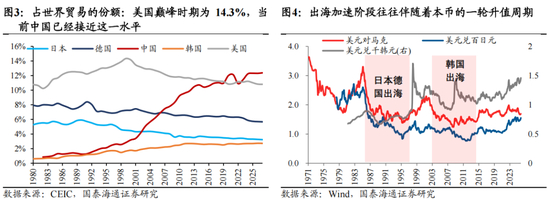 要素成本上升、市场准入约束与货币升值压力下,出海是制造业国家转型升级的必经之路。从日本、德国与韩国转型经验来看,出海既是国家的主动战略选择,同时也是现实的增长约束下的合理路径。综合来说,出海的必要性主要有三点:1)要素成本边际上升。随着人均GDP达到1万美元,经济已经越过了刘易斯拐点,这意味着农村富余劳动力逐渐向非农业转移的过程放缓,人口红利逐渐减少。此时,依赖低成本劳动力驱动的传统制造业面临利润率的急剧压缩。为了维持竞争力,企业必须将低附加值的生产环节转移至成本更低的国家;2)市场准入约束与贸易保护主义。历史经验看,当制造业大国在全球出口市场份额达到一定阈值时,经常会引发进口国的强烈反弹。在这种情况下,继续依赖单纯的商品跨境贸易已不可持续,而通过直接投资在目标市场建立本土化生产能力,即“关税跳跃型投资”成为规避关税壁垒、缓解贸易顺差压力的有效途径。3)货币升值压力与资产配置需求。随着贸易顺差的持续积累,本币通常面临巨大的升值压力。而本币升值虽然削弱了出口产品的价格竞争力,但也大幅降低了海外资产的收购成本。对于制造业国家而言,利用强势货币时期大规模收购海外技术、品牌或建立生产基地,是一种将货币优势转化为长期产业优势的战略对冲。