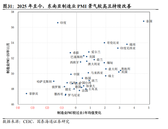 ▶宽松周期后半程全球工业与基建资本开支上行周期开启,中国资本品需求增长韧性超预期。全球进入降息周期中后期,原先受高利率环境压制的新兴市场国内信贷与发达市场基建地产等非AI部门的资本开支加速,全球跨境投资进入活跃期。中企出海的“B面”恰恰是新兴国家工业化与城镇化,而东南亚国家普遍处在人均GDP 3千至1万美元的加速阶段,对电力与基础设施、生产设备、耐用消费品有着爆发式的增量需求。同时,安全与转型压力之下非洲、拉美与中亚等资源国也在通过基建加强资源掌控力并推动工业化转型,市场空间广阔。发达市场方面,绿色转型与AI基建推动能源基础设施更新周期。欧盟重启大财政,老旧电网难以适应可再生能源并网与电车负荷冲击,设备更新需求庞大。美国AI基建激增的电力需求倒逼电力设备更新升级,通过全球产业链带动中国企业电力设备需求。2026年海外需求韧性将超市场预期。
