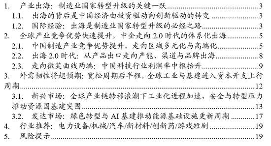 核心观点:中国企业正进入大出海时代,并向着全球价值链高端环节进军。全球宽松周期后半程,海外工业化与基建投资进入上行周期,中国科技制造外需的增长韧性或超预期。