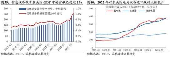 AI基建激增的电力需求倒逼美国电力设备更新升级,制造业回流也提振设备需求。AI投资对于美国经济的影响已经不容忽视,信息设备投资规模占美国GDP的比重已升至1%以上。随着AI数据中心的爆发式增长,能耗需求同样大幅提升。根据英伟达报告《800 VDC Architecture for Next-Generation AI Infrastructure》,GPU机架功率正以指数级增长,高功率密度技术的应用带来的GPU同步化运行也加剧了负载波动,这大幅提高能耗和平滑负载需求,对大型AI数据中心的部署和商业应用带来阻碍。这一方面加剧了美国电力供需的紧张,另一方面倒逼电网和发电设备的更新换代。美国本土电力设备产能严重不足,不得不增加从墨西哥、东南亚等地的进口,而这正是中国企业近年来投资或深度参与供应链的区域。因此尽管美国对华存在贸易壁垒,但其内部的资本开支结构变化依然通过全球产业链对中国企业产生间接的拉动作用。此外,美国制造业回流建厂以及基础设施法案落地的过程中,对工程机械、高空作业平台等设备产生了持续需求。