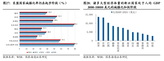 全球产业链新一轮跨国转移开启,新兴市场进入工业化与城镇化加速阶段。中国企业出海的“B面”是新兴国家工业化的加速,从更大的视角看,我们正在经历新一轮产业链跨国转移,而这一进程与20世纪初中国大陆承接日韩、中国台湾等工业产能的过程并无根本差异,关税冲突只是加速了这一进程。从人均GDP来看,世界主要新兴国家,尤其是东南亚国家普遍处于人均GDP 3千-1万美元的工业化与城镇化起步至加速阶段,对基础设施、生产设备和耐用消费品有着爆发式的增量需求。如东南亚国家当前制造业PMI处于快速提升阶段,与此同时也伴随着近年来快速增长的人均用电量与基建投入。工业化带来了对于园区建设与机械、电力电网设备的投资需求,而城镇的扩大又带动了更庞大的交通、房地产需求。工业化推动当地中产阶级的崛起,在人均GDP突破3000-5000美元关口后,对白色家电以及乘用车的需求进入增长曲线的陡峭阶段。因此我们认为,应该高度重视新兴市场工业化加速带来的资本品与耐用消费品的需求潜力与增长持续性。