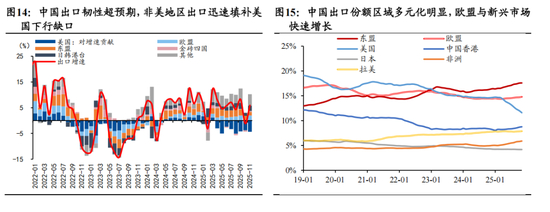 关税压力测试下,中国出口展现出极强的增长韧性。2025年关税冲突下,中国出口呈现出明显的区域多元化与高端化特征,并由此展现出极具韧性的出口增速。具体来说,中国出口区域呈现出去美化与向“全球南方”国家的转移。虽然美国仍是中国重要的出口目的地,但份额占比有所下降。中国企业一方面通过提升产品技术含量来抵消关税成本,另一方面通过在墨西哥、越南、东欧等地设厂,以“间接出口”的方式维持发达国家市场份额。与此同时,“一带一路”与新兴市场正在崛起,2023年起,东盟已成为中国第一大贸易伙伴,非洲、拉美等出口份额也出现了明显增长。这些处于工业化初中期的国家对中国的成套设备、基建服务和耐用消费品有着巨大的刚性需求,与中国当前的产业优势形成了完美的互补。此外,出口产品的高端化趋势也愈发明显,尽管2025年上半年受关税冲击影响,劳动密集型产品出现了短暂的“抢出口”脉冲,市场担忧是否会透支后续出口动能。但事实上,下半年资本品与ICT领域的出口增速明显展现出更强的增长韧性且明显高于出口整体增速,高附加值的资本与技术密集型产品已经成为中国出口的中流砥柱与增长核心。