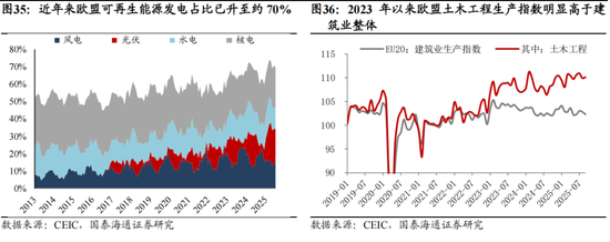 欧洲重启大财政,绿色转型下能源基建更新周期上行。欧洲当前面临基础设施老化、绿色转型加快与能源成本高企的三重困境,为实现欧洲再工业化与能源自主,欧洲正在重新加大财政开支,以更新欧洲基建并强化制造业。2025年上半年,德国通过5000亿欧元财政方案,计划主要用于基础设施更新与绿色转型。欧盟委员会表示,欧盟约40%的配电网已经使用超过40年,现有的老化电网无法适应风光等波动性可再生能源的大规模并网,也无法支撑电动汽车普及带来的负荷冲击。为此,欧盟议会2023年公布《电网行动计划》,拟投入5840亿欧元,用于检修、改善和升级欧洲电网及其相关设施。我们认为,由于欧洲本土产能不足,对中国的变压器、智能电表、高压线缆、储能等电力设备产生了巨大的外溢需求。中国企业凭借在特高压和智能电网领域的技术积累和产能优势,正在成为欧洲电网升级的重要供应商。同时,在《净零工业法案》等政策驱动下,欧洲加速推进光伏、风电和绿氢项目。尽管欧洲试图扶持本土供应链,但中国在光伏组件、风机部件以及锂电池领域的成本和产能优势在短期内难以被替代。中国企业通过在欧洲本土设厂的方式,深度嵌入其绿色转型的资本开支周期中,规避了贸易壁垒。