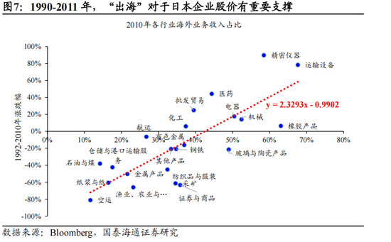 人均GDP 1.5万美元后,制造业国家出海进入加速阶段。从海外制造业国家转型经验看,人均GDP在1.5万-3万美元是产能出海加速期,国家对外投资流量增长,且GNP与GDP的差距开始明显拉大。以日本经验为例,20世纪80年代中期日本出口份额达到顶峰,而后随着对美顺差持续拉大,美国国会频繁通过针对日本产品的报复性法案,1985年签署的《广场协议》导致日元在短时间内大幅升值,这对以出口为主的日本制造业构成了严重打击。面对内忧外患,通产省政策导向发生了根本性转变。此前通产省主要致力于保护国内产业、促进出口,80年代中后期则开始大力推行“国际协调”政策,利用行政指导鼓励企业出海。1986年的《前川报告》明确提出了调整经济结构、扩大内需、促进海外直接投资的战略方向。日本一方面通过在美国本土建立工厂绕开自愿出口限制(VERs)和反倾销税,另一方面将成本敏感型行业迁至“亚洲四小龙”等新兴市场,形成“雁型模式”,日本本土则保留了高附加值的零部件生产、研发和核心装备制造。从结果看,1990-2011年日本行业指数涨跌幅与海外业务收入占比呈显著正相关关系。当前中国人均GDP 1.33万美元(2024年),GNP仍然小于GDP,我们认为,下阶段中国企业出海有望持续加快。
