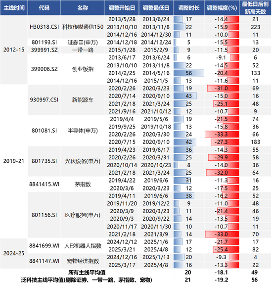 我们在《如何看科技调整:主线板块下跌时间、幅度复盘20251019》中指出:①历史上的主线行情,大多都会经历“趋势-横盘-趋势延续”的过程;②主线的【均线偏离度】更多决定了行情短期走势,而【产业趋势】是决定主线横盘之后是否会新高的根本;③如果陷入横盘,主线平均调整时长为21个交易日,平均调整幅度为19.2%(从高点到低点)。
