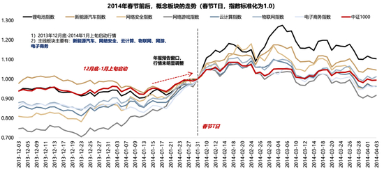 2014年“春季躁动” :12月底-1月上旬启动、年报预告窗口无调整。2014年“春季躁动” :2013年12月底-2014年1月上旬启动行情。主线板块主要有:新能源汽车、网络安全、云计算、物联网、网游、电子商务。期间,1月份的年报预告窗口,市场行情并未明显调整。